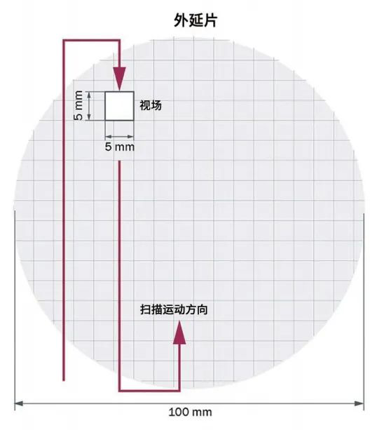 圖6顯示了晶圓5mm2視(shi)場的(de)掃(sao)描策(ce)略。幾(ji)秒內就能(neng)處(chu)理一(yi)塊6英寸晶圓,滿足(zu)行業對(dui)吞(tun)吐量的(de)需求(qiu)。原則上(shang),采(cai)用這(zhe)種方法可以(yi)處(chu)理直徑(jing)為平臺移(yi)動范圍的(de)晶片。然而實際上(shang)8英寸是MicroLED顯示器(qi)的(de)當前上(shang)限,因為它們具有(you)高平坦度和層均勻(yun)性(xing)的(de)要求(qiu)。