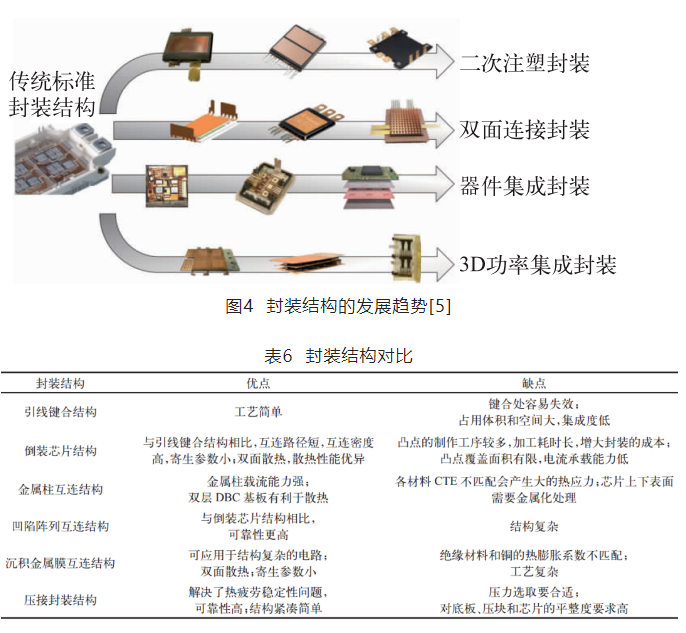 根據芯片(pian)組裝(zhuang)方式(shi)(shi)(shi)(shi)(shi)和(he)互(hu)(hu)(hu)連(lian)工(gong)藝的(de)(de)不同,功率電(dian)子(zi)封(feng)(feng)(feng)裝(zhuang)結(jie)(jie)構(gou)(gou)(gou)可(ke)分為焊接(jie)式(shi)(shi)(shi)(shi)(shi)封(feng)(feng)(feng)裝(zhuang)和(he)壓接(jie)式(shi)(shi)(shi)(shi)(shi)封(feng)(feng)(feng)裝(zhuang)兩種(zhong)形式(shi)(shi)(shi)(shi)(shi)。封(feng)(feng)(feng)裝(zhuang)結(jie)(jie)構(gou)(gou)(gou)的(de)(de)發(fa)展趨勢(shi)如(ru)圖4所示,其中(zhong)焊接(jie)式(shi)(shi)(shi)(shi)(shi)封(feng)(feng)(feng)裝(zhuang)可(ke)以采(cai)用引(yin)(yin)線(xian)(xian)鍵合、倒裝(zhuang)芯片(pian)(BGA互(hu)(hu)(hu)連(lian))、金屬(shu)(shu)柱(zhu)互(hu)(hu)(hu)連(lian)、凹陷(xian)陣列互(hu)(hu)(hu)連(lian)、沉積金屬(shu)(shu)膜互(hu)(hu)(hu)連(lian)等結(jie)(jie)構(gou)(gou)(gou)。壓接(jie)式(shi)(shi)(shi)(shi)(shi)封(feng)(feng)(feng)裝(zhuang)是借(jie)助外界機械壓力(li)形成(cheng)(cheng)互(hu)(hu)(hu)連(lian)結(jie)(jie)構(gou)(gou)(gou)。為了便于對比分析(xi),將上述幾種(zhong)封(feng)(feng)(feng)裝(zhuang)方式(shi)(shi)(shi)(shi)(shi)的(de)(de)優缺(que)點列于表6。引(yin)(yin)線(xian)(xian)鍵合具(ju)有技(ji)術成(cheng)(cheng)熟、成(cheng)(cheng)本低、布(bu)線(xian)(xian)靈活等優點。然而(er),引(yin)(yin)線(xian)(xian)鍵合的(de)(de)模塊(kuai)具(ju)有較高的(de)(de)寄生電(dian)感(gan),只能從底板單(dan)面散熱(re)。并(bing)且,由于鍵合引(yin)(yin)線(xian)(xian)和(he)芯片(pian)的(de)(de)CTE不匹(pi)配,產生較大的(de)(de)熱(re)-機械應(ying)力(li),使得(de)焊點易疲勞失效,成(cheng)(cheng)為模塊(kuai)在功率循(xun)環過程中(zhong)最主(zhu)要的(de)(de)失效形式(shi)(shi)(shi)(shi)(shi)。