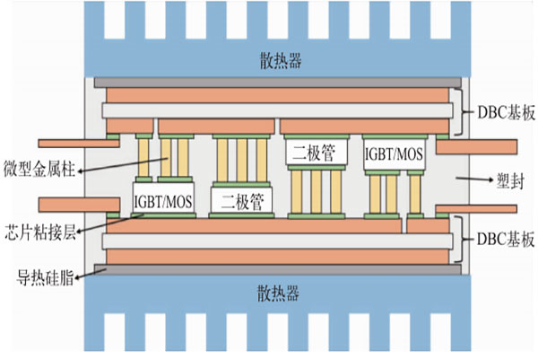 雙面連接結構是將芯片分別與上、下基板連接,例如西門康公司提出的SKiN功率模塊、富士電機提出的銅針互連SiC功率模塊等,可以達到去除鍵合引線的目的。雙面連接封裝結構主要有兩個優點:(1)消除發射極表面的引線鍵合,有效降低寄生電感,減小電壓過沖和功率損耗,提高開關性能;(2)實現芯片上下兩個方向散熱,提高散熱效率,有效降低芯片結溫,從而減緩失效。美國橡樹嶺國家實驗室提出了一種雙面連接DBC基板封裝的Si IGBT或SiC MOSFET功率模塊,相比于傳統的引線鍵合模塊,其電感降低62%,開關損耗降低50%~90%,散熱效率提高40%~50%。
