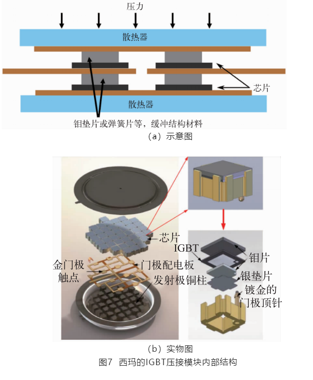 除(chu)了(le)上述焊接式連接之外,還可以(yi)通過壓(ya)(ya)(ya)接形成(cheng)(cheng)三維封裝,典型案例如(ru)圖7所示,為西碼(ma)(Westcode)IGBT壓(ya)(ya)(ya)接模(mo)塊內(nei)部結(jie)構(gou)(gou)圖,各(ge)組(zu)件由外部施加的機(ji)械壓(ya)(ya)(ya)力取代引線、釬焊或燒結(jie)形成(cheng)(cheng)物(wu)理連接,結(jie)構(gou)(gou)簡單(dan)、成(cheng)(cheng)本(ben)較低(di)(di)、可靠性高(gao),在高(gao)壓(ya)(ya)(ya)大電(dian)(dian)流電(dian)(dian)網中(zhong)得到(dao)了(le)廣泛(fan)應用。但(dan)是在壓(ya)(ya)(ya)接模(mo)塊中(zhong),對模(mo)塊的內(nei)部尺寸、各(ge)組(zu)件的平整(zheng)度和(he)(he)(he)表(biao)面質量要(yao)求(qiu)高(gao),接頭的導熱(re)和(he)(he)(he)導電(dian)(dian)性能(neng)受壓(ya)(ya)(ya)力大小和(he)(he)(he)均勻(yun)性的影響很大,需要(yao)選(xuan)擇(ze)合適的合模(mo)壓(ya)(ya)(ya)力來保證較小的接觸電(dian)(dian)阻(zu)和(he)(he)(he)接觸熱(re)阻(zu),但(dan)會不可避(bi)免地受到(dao)表(biao)面粗糙度和(he)(he)(he)結(jie)構(gou)(gou)變形的影響。在壓(ya)(ya)(ya)接結(jie)構(gou)(gou)中(zhong)常引入(ru)CTE較小的彈(dan)性緩沖(chong)結(jie)構(gou)(gou)和(he)(he)(he)材料(liao),如(ru)Mo或Be墊片(pian)、彈(dan)簧(huang)片(pian)等,來均勻(yun)壓(ya)(ya)(ya)力、降(jiang)低(di)(di)熱(re)-機(ji)械應力,提高(gao)可靠性。