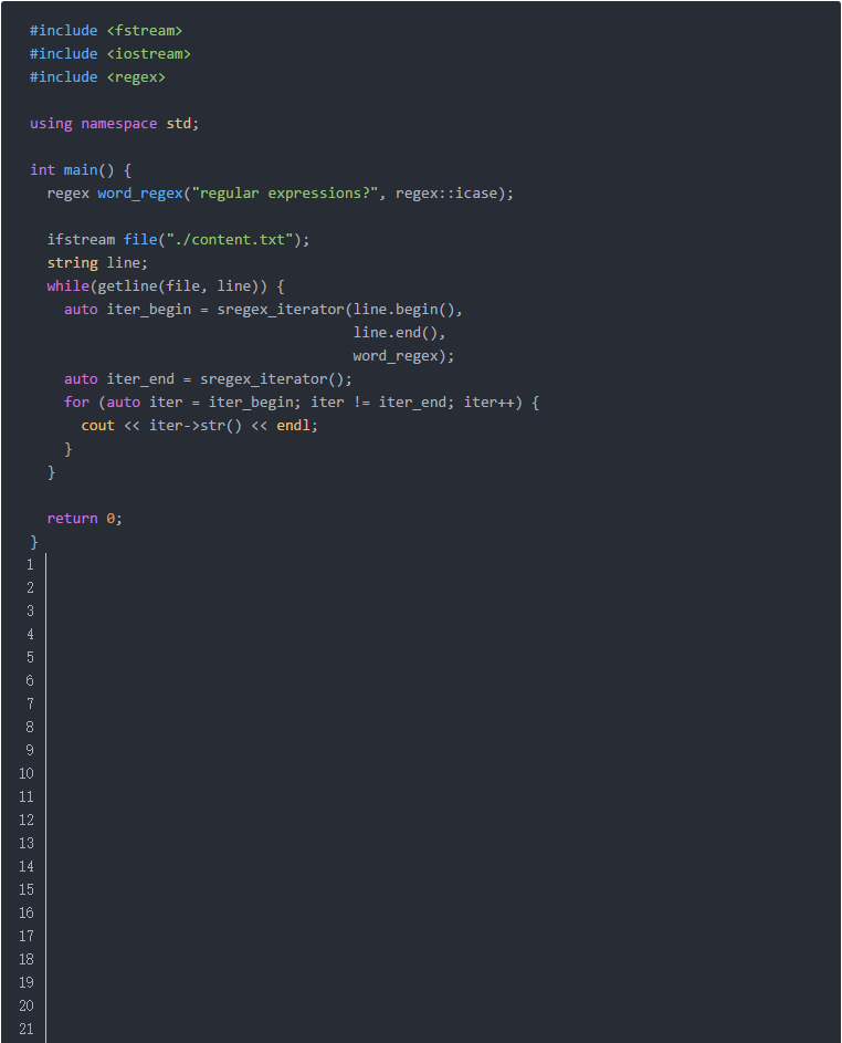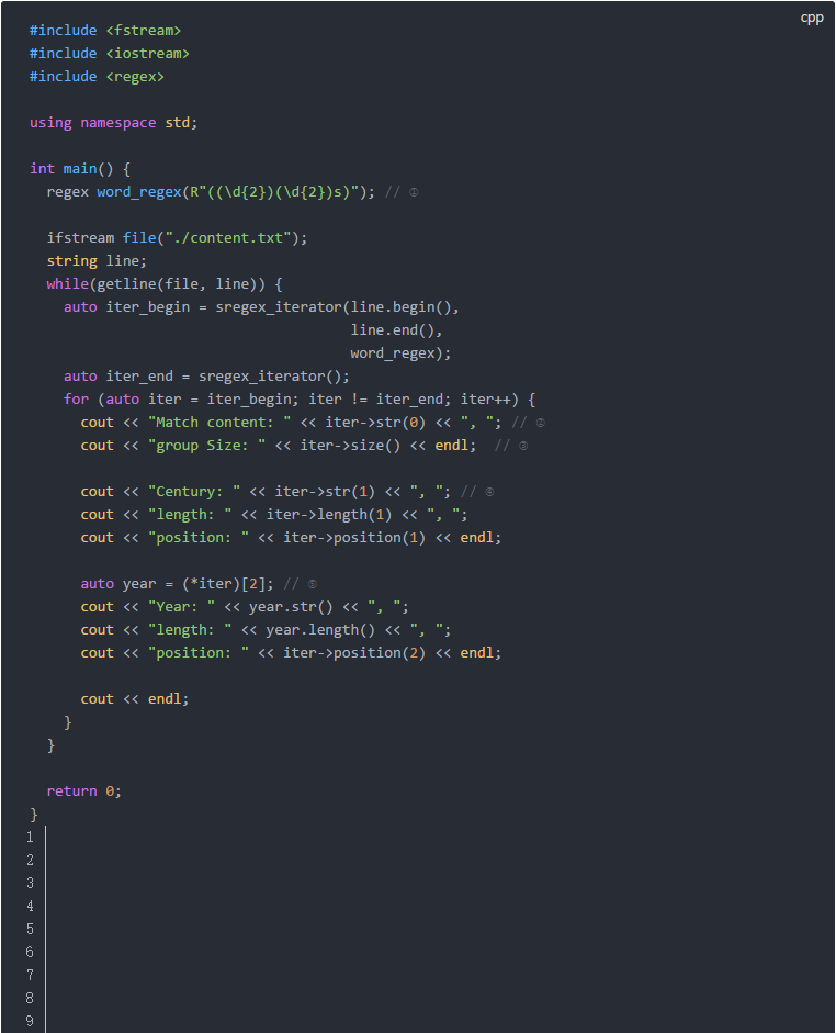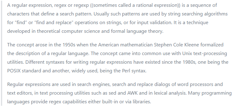 接下來我們會看到更多的示例。同時,也會看到C++正則表達式API的更多功能。 為了便于下文示例的講解,我們以維基百科上對于正則表達式的介紹文本為基礎。