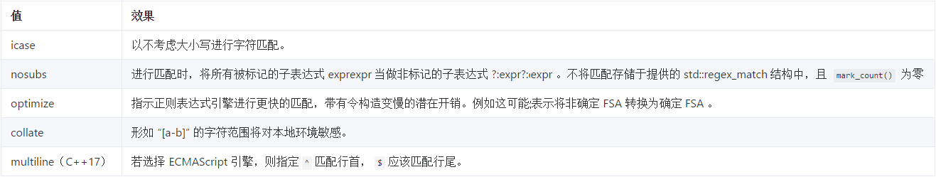 在創建正則表達式對象的時候,除了描述規則本身的字符串之外,還可以傳遞一個flag_type類型的參數,該參數的值定義在std::regex_constants::syntax_option_type中。它們中與“文法”相關的已經在上文介紹過了。