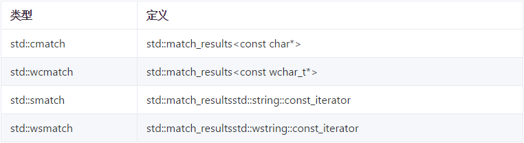 std::match_results用來存(cun)儲匹(pi)配結(jie)果(guo)。與(yu)迭代(dai)器(qi)類似,匹(pi)配結(jie)果(guo)也有四種類型(xing):