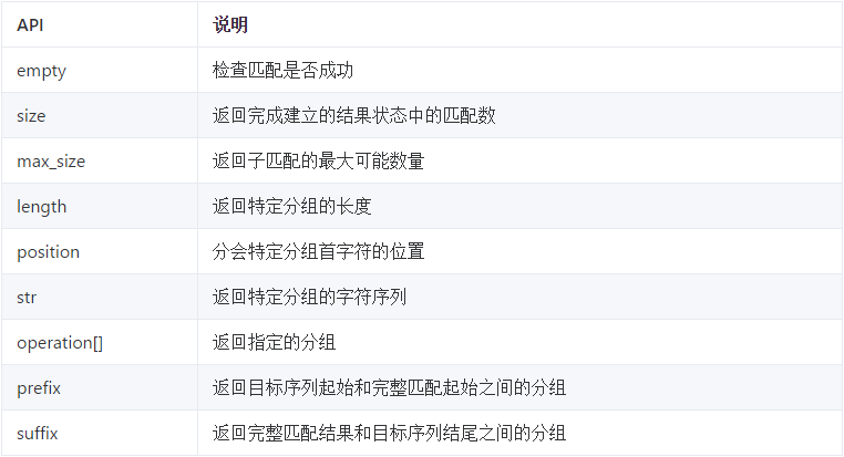 這些(xie)分組(zu)最(zui)終可以在匹(pi)配完成之后,可以通過std::match_results的API來獲取。這些(xie)API如下表所示: