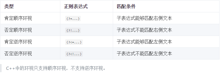 環視(shi)是對匹(pi)配位(wei)置的(de)附加條件(jian)(jian),只(zhi)有條件(jian)(jian)滿足(zu)時才能完成匹(pi)配。環視(shi)有:順(shun)序(xu)(向右),逆序(xu)(向左),肯定和否定一共四(si)種(zhong):