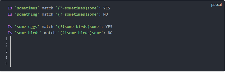 對于包含環視的正則表達式來說,環視之外的內容是匹配的主體,環視本身只是一個附件條件。(?=sometimes)這個肯定順序環視要求從這個位置開始,接下來的字符串必須是"sometimes"才能完成匹配。(?!some birds)這個否定順序環視要是接下來的字符串一定不能是"some birds"才能完成匹配。