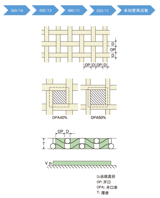 網(wang)紗目(mu)數(shu)為1英(ying)寸(cun)*1英(ying)寸(cun)的(de)網(wang)紗內含有的(de)網(wang)目(mu)數(shu)量。目(mu)數(shu)一般可(ke)以說明絲(si)網(wang)的(de)絲(si)與(yu)絲(si)之(zhi)間的(de)疏(shu)密程度。目(mu)數(shu)越(yue)高絲(si)網(wang)越(yue)密,網(wang)孔(kong)(kong)越(yue)小;反之(zhi),目(mu)數(shu)越(yue)低絲(si)網(wang)越(yue)稀疏(shu),網(wang)孔(kong)(kong)越(yue)大。網(wang)孔(kong)(kong)越(yue)小,漿(jiang)料通過性越(yue)差(cha),網(wang)孔(kong)(kong)越(yue)大,漿(jiang)料通過性就(jiu)越(yue)好。由于電池印刷環節中(zhong)對漿(jiang)料線(xian)寬的(de)要(yao)求(qiu)越(yue)來(lai)越(yue)高,因此,目(mu)前常(chang)規網(wang)版都有朝(chao)高目(mu)數(shu)發(fa)展的(de)趨勢