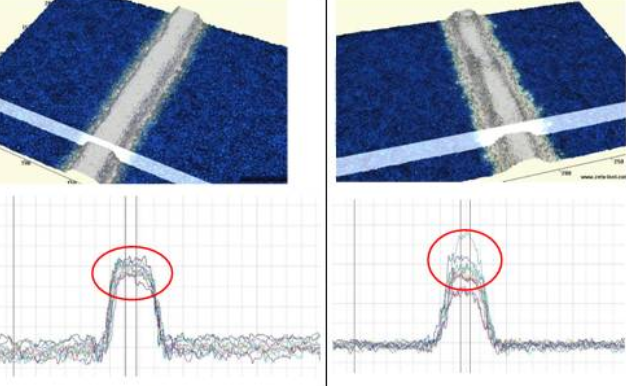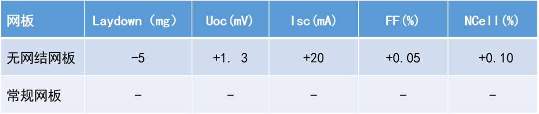 無網結(jie)網版印刷(shua)后(hou)高(gao)寬比(bi),線(xian)型(xing)明顯優于(yu)常規網版(如圖(tu)6所示),通過高(gao)寬比(bi)提升(sheng)以及線(xian)型(xing)優化(hua),電(dian)池片(pian)短路(lu)電(dian)流,開壓,填充均能得到較大提升(sheng),從而顯著(zhu)提升(sheng)效(xiao)率,同時線(xian)寬的(de)縮窄可顯著(zhu)降低單(dan)耗(hao),具體數據如下: