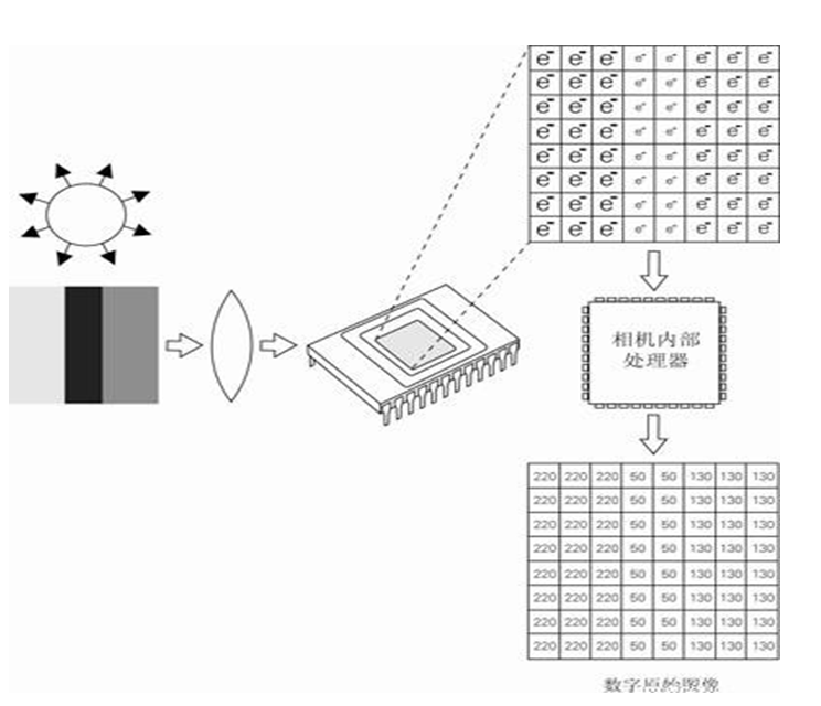 如(ru)圖(tu)所(suo)示,物(wu)體在(zai)有光(guang)線(xian)照射到它時將會產生反射,這些反射光(guang)線(xian)進入鏡頭光(guang)圈照射在(zai)CCD芯片上,在(zai)各個單元(yuan)中生成電(dian)子。