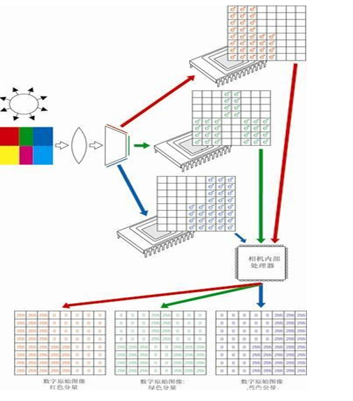 在這種情況下,如果我們希望使用 CCD 作為相機感光芯片,并輸出紅、綠、藍三色分量,就可以采用一個分光棱鏡和三個 CCD,如右圖所示。棱(leng)鏡將光線中的紅、綠、藍(lan)三個(ge)(ge)基本(ben)色(se)分開,使其分別投(tou)射在(zai)一(yi)個(ge)(ge) CCD 上。這(zhe)樣以(yi)來,每個(ge)(ge) CCD 就只(zhi)對一(yi)種基本(ben)色(se)分量感(gan)光。