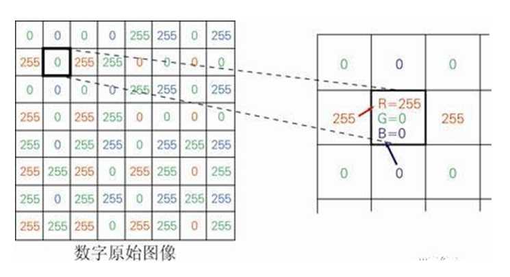 在源圖像中(zhong)該點實際是紅(hong)色的(de)(de),但經拜爾濾鏡中(zhong)綠色鏡片(pian)過濾后,該點色值為零(ling)。我們只需要把臨近(jin)紅(hong)藍像素中(zhong)的(de)(de)紅(hong)色與藍色值復制到該像素中(zhong),就能獲得其(qi)RGB值(255,0,0)。