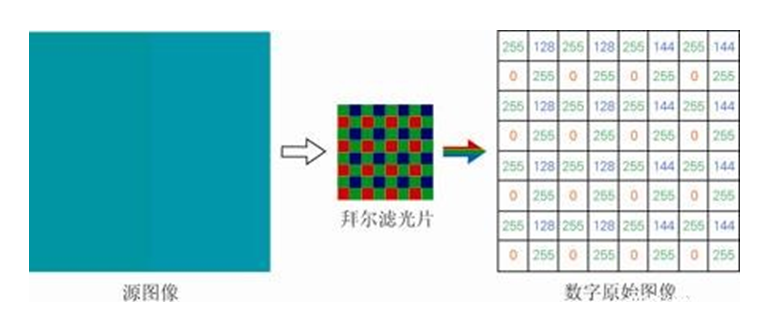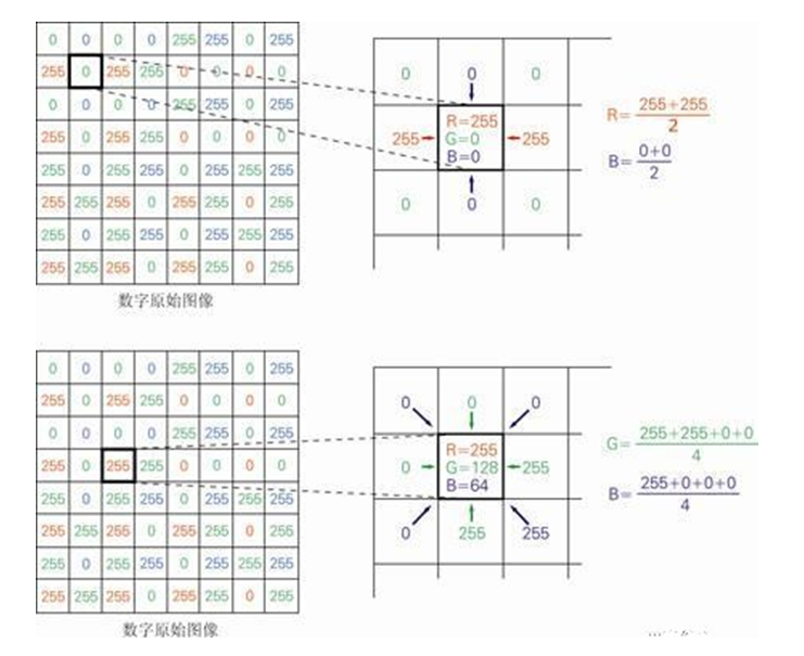 如上圖所示,該濾鏡的色彩搭配形式為:一行使用藍綠元素,下一行使用紅綠元素,如此交替;換言之,CCD 中每4個像素中有2個對綠色分量感光,另外兩個像素中,一個對藍色感光、一個對綠色感光。從而使得每個像素只含有紅、綠、藍三色中一種的信息,但我們希望的是每個像素都含有這三種顏色的信息。