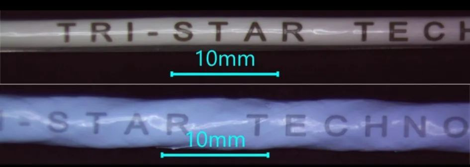 圖2. ETFE(頂(ding)部)和PTFE(底部)電線(xian)上(shang)的(de)紫外激光打標