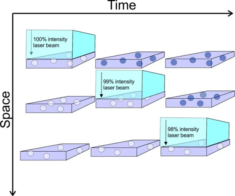 圖4說明了空間和時間的(de)過程。入射激光束自由穿透(tou)第一(yi)層(ceng)(ceng)(ceng)材料(liao)層(ceng)(ceng)(ceng),在(zai)與原(yuan)始白色TiO2顆粒相互(hu)作用(yong)時損失其總能(neng)量的(de)一(yi)小部(bu)分(fen)(例如(ru),1%),將它(ta)們變成黑色。同(tong)樣的(de)事情發生在(zai)第二層(ceng)(ceng)(ceng),依此類推,直到大部(bu)分(fen)激光脈沖能(neng)量在(zai)頂部(bu)50-100層(ceng)(ceng)(ceng)內被(bei)吸收(shou)。實際上,該(gai)過程在(zai)時間和空間上都非(fei)常有限,因為總脈沖持續時間通常低于(yu)30ns,標記深度(du)不(bu)超過50um左右。