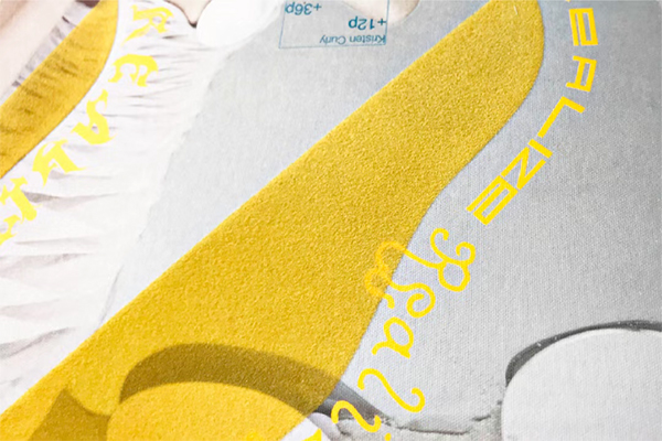 將五(wu)彩(cai)(cai)(cai)繽紛(fen)的添加劑彩(cai)(cai)(cai)蔥粉與印(yin)刷油墨(mo)(通常是與UV油墨(mo))結(jie)合使用,在印(yin)刷油墨(mo)未干(gan)燥時,在其表面鋪上彩(cai)(cai)(cai)蔥粉,干(gan)燥后形(xing)成顆粒狀的彩(cai)(cai)(cai)蔥效果。