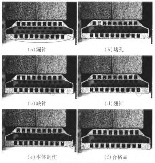根據生產實際統計,連接器缺陷特征主要包括:① 漏針:本體槽內無針,金屬物缺失;② 堵孔:本體槽內填充有異物,針被遮擋;③ 缺針:個別本體槽無針;④ 翹針:針彈起高度超過允許值;⑤ 本體刮(gua)傷:本體端(duan)面受機(ji)械(xie)損傷。