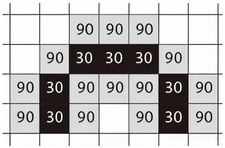 眼(yan)睛中央部(bu)分(fen)(fen)較(jiao)黑,周圍較(jiao)淡,因此(ci)中央部(bu)分(fen)(fen)的數(shu)值(zhi)是 “30”,周圍部(bu)分(fen)(fen)的數(shu)值(zhi)是 “90”。