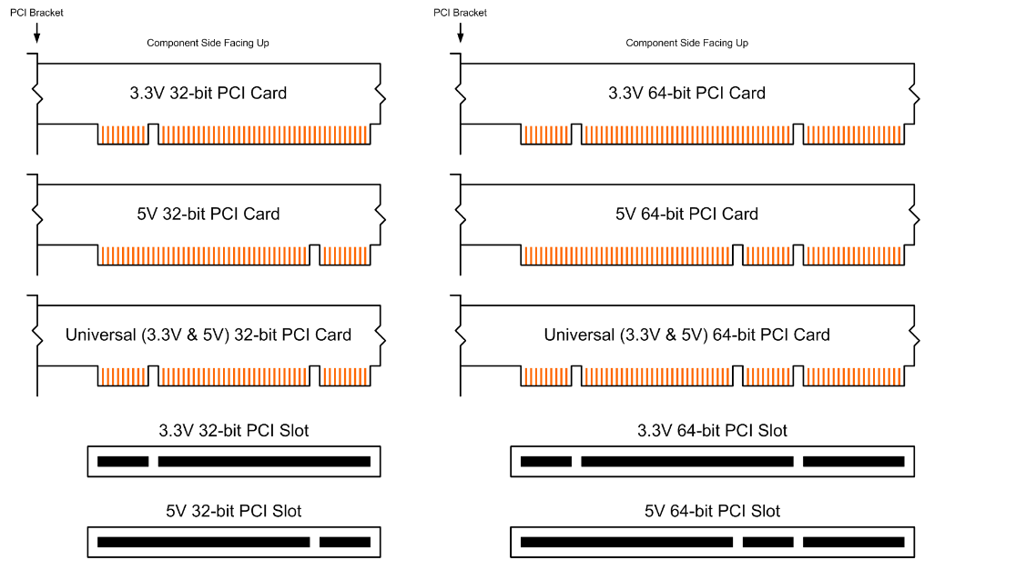 PCI有(you)幾種不同的(de)(de)接口樣圖(tu):現在生產的(de)(de)多為通(tong)用模式的(de)(de)以防插錯。還有(you)64bit統(tong)一(yi)比(bi)32bit的(de)(de)寬出右(you)邊缺口的(de)(de)部分。