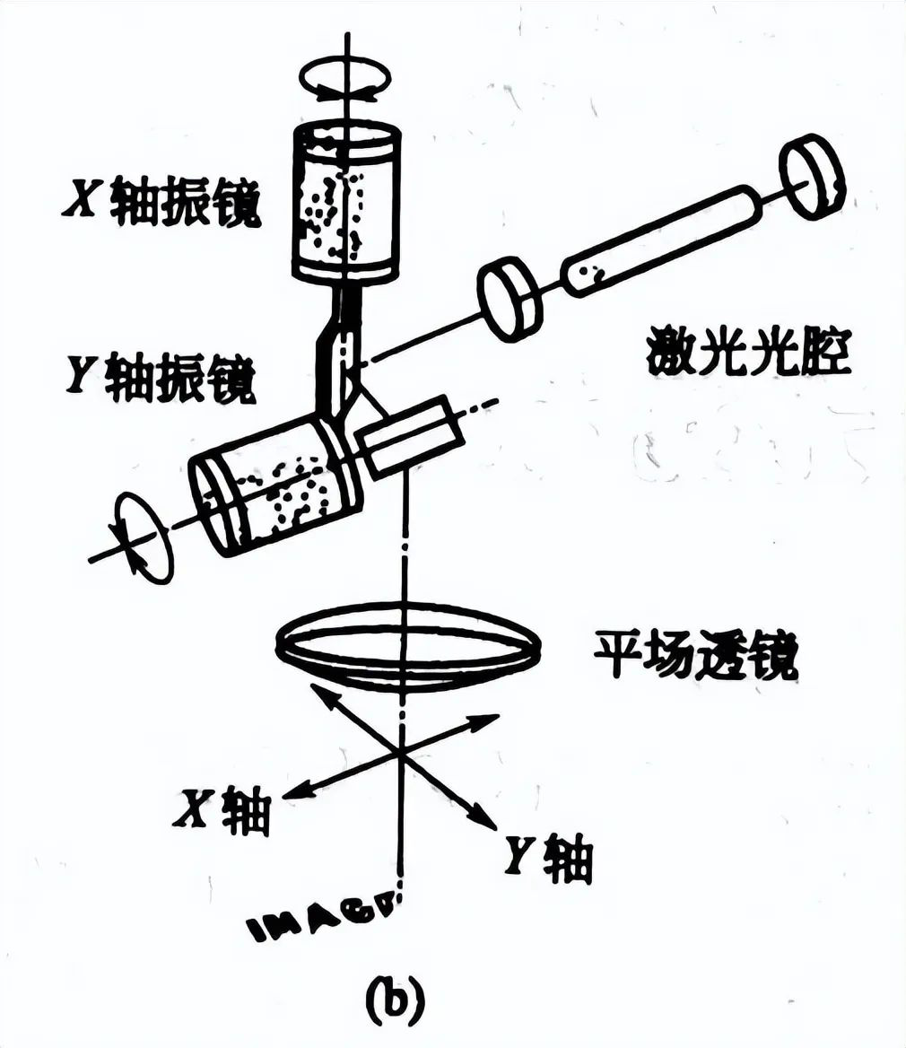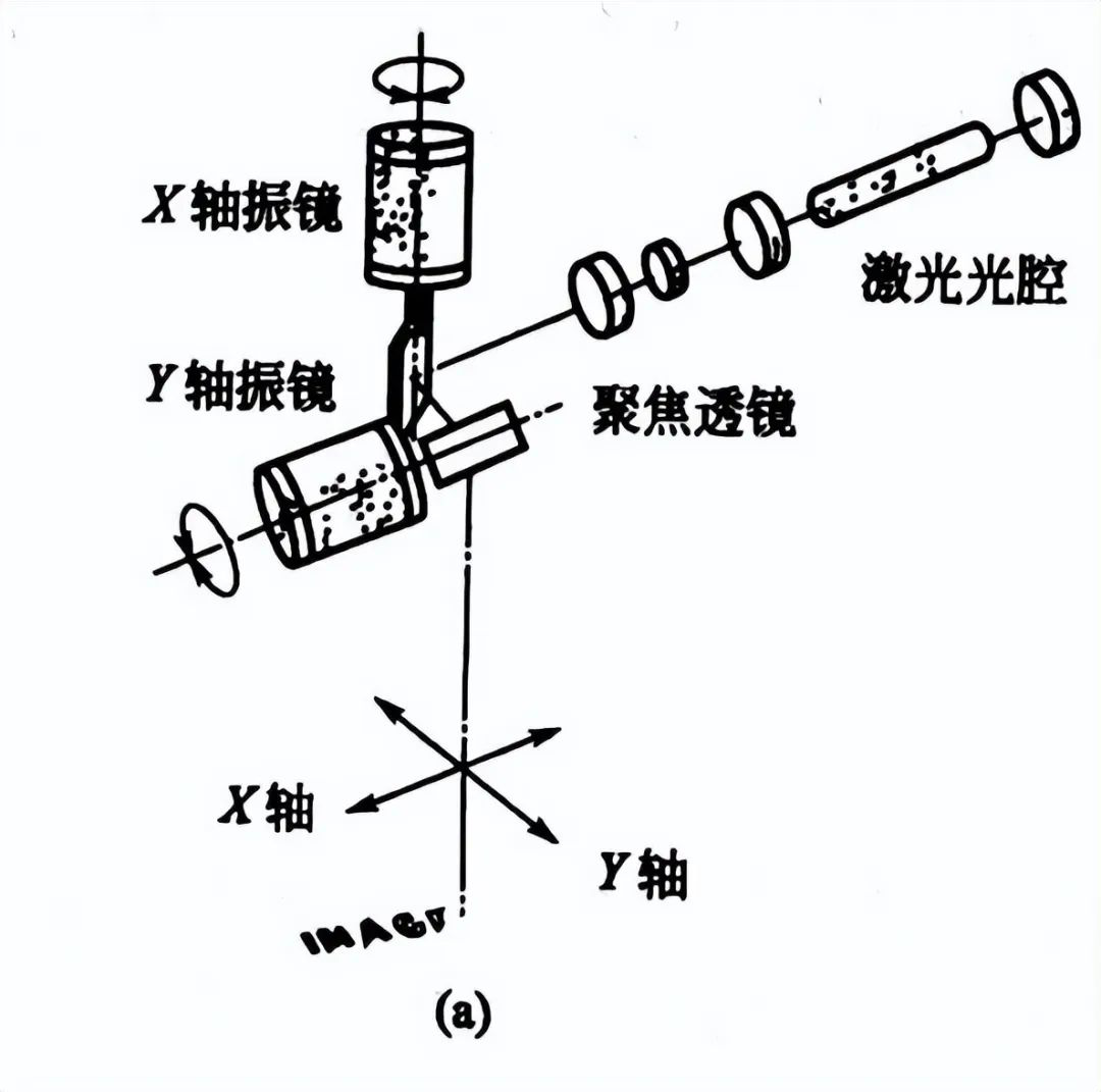 振(zhen)鏡(jing)(jing)式激光打標的結構主要由(you)調QYAG激光器、高速振(zhen)鏡(jing)(jing)系(xi)統(tong)(tong)、計算機(ji)控制系(xi)統(tong)(tong)等部(bu)分組(zu)成。利(li)用計算機(ji)系(xi)統(tong)(tong)控制振(zhen)鏡(jing)(jing)系(xi)統(tong)(tong)沿XY軸掃(sao)描在某個確(que)定的面上標刻出數字、文字圖(tu)形(xing)等。圖(tu)4-61所示為振(zhen)鏡(jing)(jing)式激光打標法原理。聚焦形(xing)式有兩種(zhong):一種(zhong)是先聚焦再(zai)經振(zhen)鏡(jing)(jing)系(xi)統(tong)(tong)照射到工(gong)件(jian)上,如圖(tu)(a)所示;