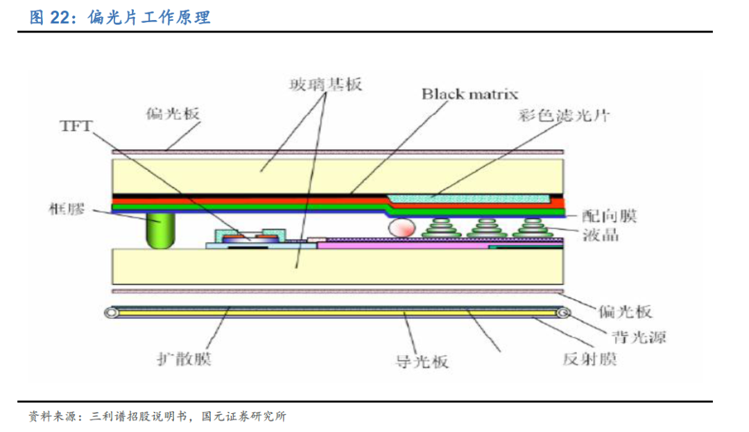 偏(pian)光(guang)片是顯示面(mian)板的關鍵原材料之一。偏(pian)光(guang)片可以控制特定光(guang)束的方向,自然光(guang)在(zai) 通過(guo)偏(pian)光(guang)片時,與偏(pian)光(guang)片透過(guo)軸垂直的光(guang)將被吸收無法通過(guo),從而只留下與偏(pian)光(guang)片 透過(guo)軸平行(xing)的光(guang)線,形成明暗對(dui)比,達到(dao)畫面(mian)顯示的功能。