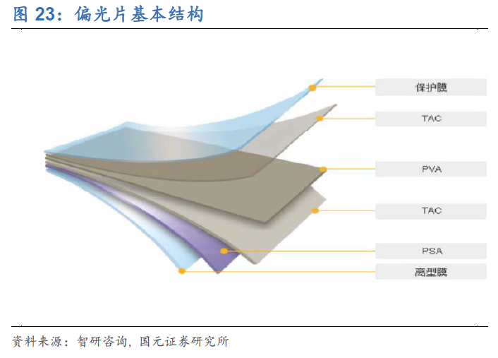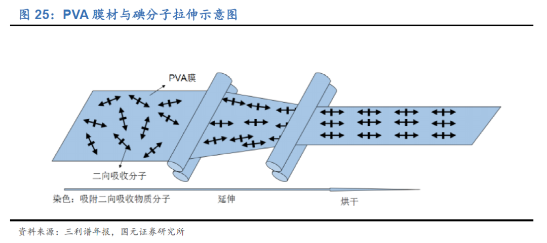 偏光片主要是由 PVA 膜、TAC 膜、保護膜、離型膜和壓敏膠等復合制成,其中起偏振作用的(de)核(he)心膜(mo)材是 PVA 膜(mo),該材料決定了偏光片的(de)偏光性能(neng)、透光度、偏振度、 色調等(deng)關鍵(jian)光學(xue)指標。PVA 膜(mo)經(jing)過(guo)染(ran)色后吸附具有(you)二向吸收功能(neng)的(de)碘分(fen)子(zi),通(tong)過(guo)拉 伸使得碘分(fen)子(zi)在 PVA 膜(mo)上有(you)序排列(lie),形成具有(you)均勻二向吸收功能(neng)的(de)偏光膜(mo) ,其透 過(guo)軸與拉伸的(de)方向垂直。