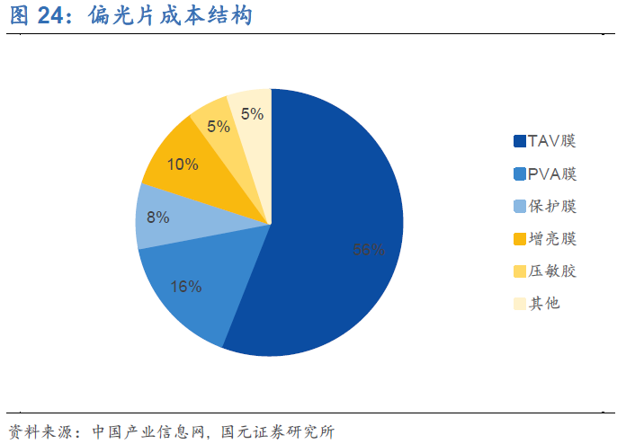 TAC 膜是偏光片另一重要原材料,占偏光片總成本的 54%。TAC 膜充當 PVA 膜的(de)(de)(de)支(zhi)撐體,保證了 PVA 膜的(de)(de)(de)延(yan)伸不會回縮(suo),另外(wai) TAC 膜還(huan)具有優(you)異(yi)的(de)(de)(de)耐紫(zi)外(wai)線、耐 酸堿特性(xing),保護 PVA 膜不受到水汽、紫(zi)外(wai)線等外(wai)界環(huan)境因素損害(hai)。PSA(壓敏膠(jiao)) 是偏光(guang)片(pian)(pian)貼(tie)合(he)在(zai) LCD 面板(ban)上的(de)(de)(de)膠(jiao)材,決(jue)定了偏光(guang)片(pian)(pian)的(de)(de)(de)粘著性(xing)能(neng)以(yi)及貼(tie)片(pian)(pian)加(jia)工(gong)性(xing)能(neng)。偏光(guang)片(pian)(pian)按照 PVA 膜的(de)(de)(de)拉(la)(la)(la)伸工(gong)藝(yi)可以(yi)分為干(gan)法拉(la)(la)(la)伸和濕法拉(la)(la)(la)伸兩大類。干(gan)法拉(la)(la)(la)伸工(gong)藝(yi)是對 PVA 膜先進(jin)(jin)(jin)行(xing)拉(la)(la)(la)伸,后進(jin)(jin)(jin)行(xing)染(ran)色、固(gu)色、復合(he)、干(gan)燥等工(gong)藝(yi);而濕法拉(la)(la)(la)伸是將(jiang) PVA 膜先進(jin)(jin)(jin)行(xing)染(ran)色,在(zai)溶液中進(jin)(jin)(jin)行(xing)拉(la)(la)(la)伸、固(gu)色、復合(he)、干(gan)燥等工(gong)藝(yi)。目前偏光(guang)片(pian)(pian) 廠商(shang)主要是以(yi)濕法拉(la)(la)(la)伸技術為主。