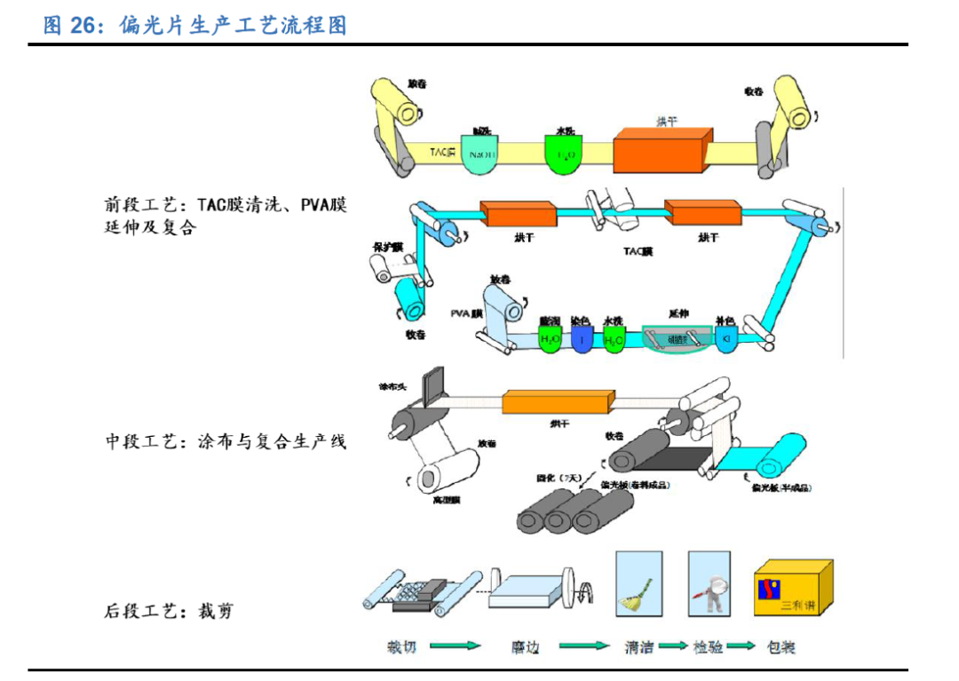 偏(pian)光片的(de)主(zhu)流生(sheng)(sheng)產(chan)(chan)工(gong)藝(yi)(yi)流程(cheng)可以分為前、中(zhong)、后(hou)三段(duan)(duan)工(gong)藝(yi)(yi),其(qi)中(zhong)前段(duan)(duan)工(gong)藝(yi)(yi)是偏(pian)光片 生(sheng)(sheng)產(chan)(chan)的(de)核(he)心環節。前段(duan)(duan)工(gong)藝(yi)(yi)包(bao)括(kuo)對 TAC 膜(mo)(mo)(mo)(mo)的(de)清(qing)(qing)洗和 PVA 膜(mo)(mo)(mo)(mo)的(de)延伸(shen)及(ji)復(fu)(fu)(fu)(fu)合(he)(he)。將 TAC膜(mo)(mo)(mo)(mo)進(jin)行堿液(ye)處理,清(qing)(qing)洗之后(hou)烘干收(shou)卷,降低 TAV 膜(mo)(mo)(mo)(mo)的(de)接觸角。PVA 膜(mo)(mo)(mo)(mo)的(de)延伸(shen)和復(fu)(fu)(fu)(fu)合(he)(he)是將 PVA 膜(mo)(mo)(mo)(mo)浸入染色槽(cao),吸(xi)附二向(xiang)吸(xi)收(shou)的(de)碘分子,再(zai)進(jin)行拉伸(shen)取向(xiang),烘干后(hou)與 TAC 膜(mo)(mo)(mo)(mo)復(fu)(fu)(fu)(fu)合(he)(he)在一起,得到偏(pian)光膜(mo)(mo)(mo)(mo)。中(zhong)段(duan)(duan)工(gong)藝(yi)(yi)是涂布壓敏膠與復(fu)(fu)(fu)(fu)合(he)(he)離型膜(mo)(mo)(mo)(mo)等其(qi)他膜(mo)(mo)(mo)(mo)材的(de)制程(cheng)。后(hou)段(duan)(duan)工(gong)藝(yi)(yi)是將固化好的(de)偏(pian)光片按照需(xu)要(yao)的(de)尺寸大小進(jin)行裁剪(jian)、磨邊、清(qing)(qing)潔、檢驗及(ji)包(bao)裝。