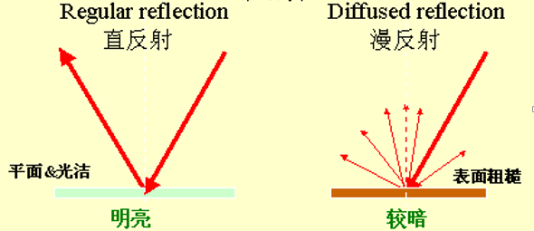 直反射:光線的反射角等于入射角。直反射有時用途很大,有時又可能產生極強的眩耀。在大多數情況應避免鏡面反射。
