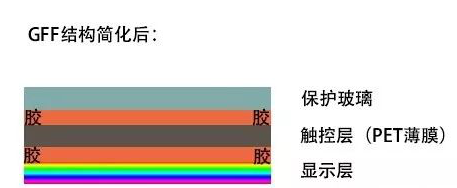 為什么(me)說 GFF是(shi)偽(wei)全貼(tie)(tie)合工藝呢? 因為GFF屏(ping)幕依(yi)然(ran)是(shi)由(you)保護玻璃、觸控層(ceng)和顯示層(ceng)三(san)個獨立層(ceng)組成的,其 觸控層(ceng)仍然(ran)獨立存在。只是(shi) GFF工藝直接將上(shang)面非(fei)全貼(tie)(tie)合方式中間觸控層(ceng)玻璃換為PET薄膜(mo),并用光學膠(水膠)完全將空氣層(ceng)填(tian)充。