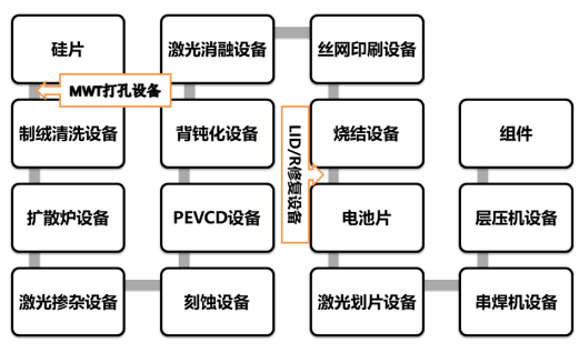 2)LID/R修復設備:采用(yong)超高功率(lv)激(ji)光照(zhao)(zhao)射電(dian)池片,減少(shao)載(zai)流(liu)(liu)子復合損(sun)失,從而降(jiang)低(di)光致衰減現象。通常而言(yan),降(jiang)低(di)光致衰減的(de)主流(liu)(liu)方法為熱(re)處理、鹵素燈照(zhao)(zhao)射等,均(jun)可與燒結工序結合完成,因(yin)此(ci)目前激(ji)光修復在(zai)P型電(dian)池應用(yong)較少(shao)。