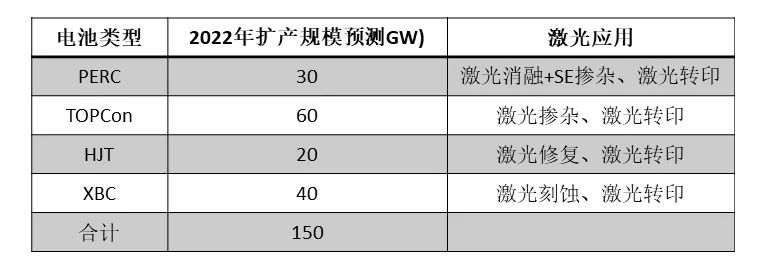 激(ji)(ji)光(guang)(guang)在N型(xing)電池中的應用包(bao)括激(ji)(ji)光(guang)(guang)摻雜、激(ji)(ji)光(guang)(guang)修復、激(ji)(ji)光(guang)(guang)刻蝕、激(ji)(ji)光(guang)(guang)轉印等,價值(zhi)量(liang)較PERC時代(dai)有(you)望成倍增長,因此(ci)N型(xing)電池放量(liang)也將帶來(lai)光(guang)(guang)伏激(ji)(ji)光(guang)(guang)設(she)備(bei)市場空間快速(su)擴(kuo)容(rong)。