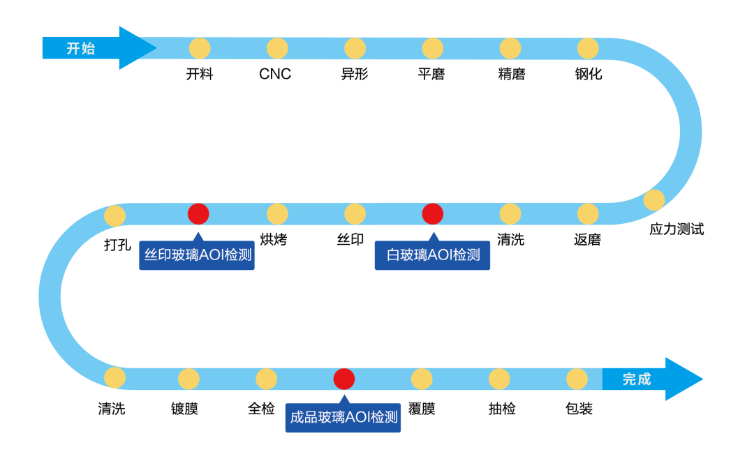 切割、CNC精雕(diao)、研磨、強化(hua)、絲(si)印、鍍膜、清洗......每一片蓋板玻璃的(de)(de)生產過(guo)程十分繁雜不易(yi),且為保證成品優質性,每一個環節(jie)都涉及到(dao)玻璃質量的(de)(de)檢(jian)測。