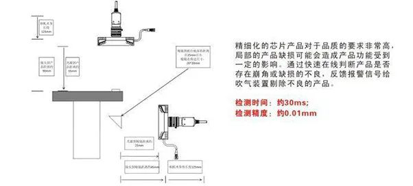 精細化的(de)芯片產(chan)(chan)(chan)品(pin)(pin)對于品(pin)(pin)質的(de)要求非(fei)常高,局部(bu)的(de)產(chan)(chan)(chan)品(pin)(pin)缺損可能(neng)會造成產(chan)(chan)(chan)品(pin)(pin)功能(neng)受(shou)到一(yi)定(ding)的(de)影(ying)響。通過快(kuai)速在線判斷產(chan)(chan)(chan)品(pin)(pin)是否在崩角或(huo)缺損的(de)不良。反饋報(bao)警信號給吹氣(qi)裝置(zhi)剔除不良的(de)產(chan)(chan)(chan)品(pin)(pin)。
