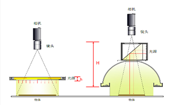 平面無影光(guang)(guang)源能提供高均(jun)勻(yun)度的(de)漫射(she)照明,可以消除產(chan)品(pin)表(biao)面不平整形(xing)成(cheng)(cheng)的(de)干擾,成(cheng)(cheng)像(xiang)效果與“圓(yuan)(yuan)頂+同(tong)軸光(guang)(guang)源組合”類似,且相比于組合光(guang)(guang)源而言,更節省空間(jian)。圖(tu)5為(wei)(wei)兩組光(guang)(guang)源的(de)成(cheng)(cheng)像(xiang)原理圖(tu),左側為(wei)(wei)平面無影光(guang)(guang)源,右側為(wei)(wei)“圓(yuan)(yuan)頂+同(tong)軸”的(de)組合光(guang)(guang)源。
