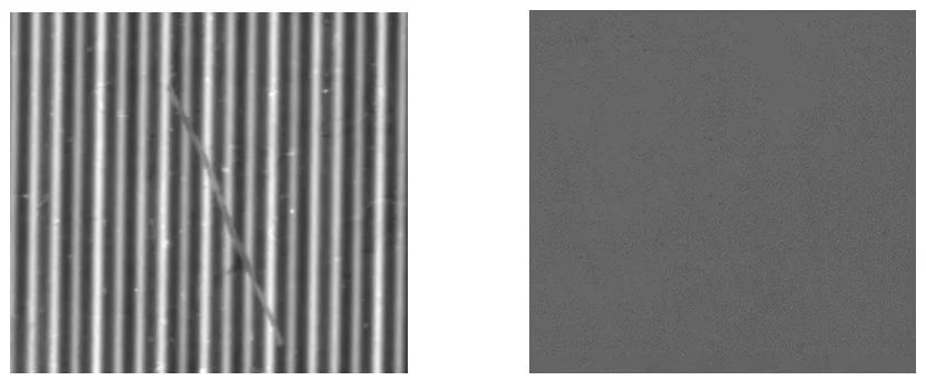 案例2:偏光膜表面變形(xing)與凹(ao)(ao)凸點檢(jian)(jian)測(ce)。圖11為平面條(tiao)(tiao)(tiao)紋光源(yuan)的(de)(de)成像圖。(a)為平面條(tiao)(tiao)(tiao)紋光源(yuan)檢(jian)(jian)膜材“變形(xing)”的(de)(de)效果(guo),(b)為平面條(tiao)(tiao)(tiao)紋光源(yuan)檢(jian)(jian)“凹(ao)(ao)凸點”的(de)(de)效果(guo),可以看到檢(jian)(jian)測(ce)圖片中有缺陷的(de)(de)地方條(tiao)(tiao)(tiao)紋明顯形(xing)變,不再呈現出平行(xing)的(de)(de)特(te)征。