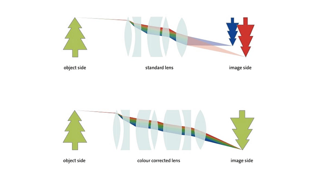 當不(bu)(bu)同波長(chang)的(de)(de)光(guang)通過空氣-玻(bo)璃界面時(shi),每(mei)個波長(chang)都會(hui)(hui)折射不(bu)(bu)同的(de)(de)量(liang)。這種(zhong)(zhong)色散是一個可測量(liang)的(de)(de)量(liang),會(hui)(hui)導致鏡頭產生色差,鏡頭的(de)(de)邊(bian)緣會(hui)(hui)模糊物體(ti)的(de)(de)邊(bian)緣,從(cong)而無法進行(xing)準確的(de)(de)機器視覺測量(liang)。有(you)數(shu)百種(zhong)(zhong)具有(you)不(bu)(bu)同色散特性(xing)的(de)(de)不(bu)(bu)同光(guang)學玻(bo)璃類(lei)型可供(gong)選擇,從(cong)而可以生產具有(you)各種(zhong)(zhong)玻(bo)璃元件以補償色差效應的(de)(de)消色差透(tou)鏡(圖 1)。使用單(dan)色光(guang)源(yuan)時(shi)只(zhi)需(xu)要更簡單(dan)的(de)(de)鏡頭設計,因為沒有(you)色差。