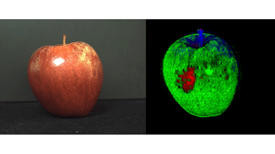 圖 4.高(gao)光譜圖像中(zhong)的(de)紅色區域顯(xian)示彩色圖像中(zhong)不可見的(de)非(fei)表面瘀傷