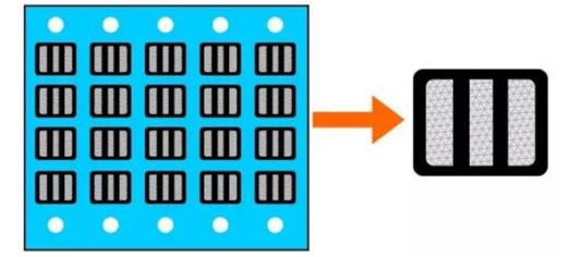 2.采用第(di)一(yi)把模具,即分(fen)條(tiao)刀,從(cong)黑(hei)色(se)和(he)(he)白色(se)之間直接分(fen)條(tiao)并模切(qie)黑(hei)色(se)的小孔和(he)(he)一(yi)個(ge)小框(kuang)(kuang)框(kuang)(kuang),半斷處,采用模具落孔轉貼廢料;