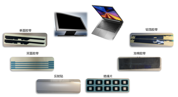 光學薄膜、偏光片、背光源、各種膠墊、背投燈元件處的反射板、擴散片、遮光膠帶等。