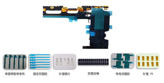 應用于FPC行業的產品:單面(mian)帶(dai)膠導電(dian)布、固定雙(shuang)面(mian)膠、補(bu)強鋼片、防震泡(pao)棉、導電(dian)雙(shuang)面(mian)膠、PI膜等。