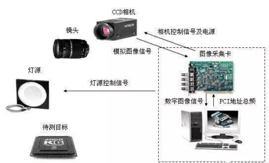 圖(tu)像(xiang)采(cai)集(ji)部分一般由光(guang)源、鏡頭(tou)、數字(zi)(zi)攝(she)(she)像(xiang)機(ji)和圖(tu)像(xiang)采(cai)集(ji)卡(ka)構成。采(cai)集(ji)過程可(ke)簡(jian)單描述為(wei)在光(guang)源提供照明的(de)條件下,數字(zi)(zi)攝(she)(she)像(xiang)機(ji)拍攝(she)(she)目(mu)標物體并(bing)將其轉化為(wei)圖(tu)像(xiang)信號,最后通過圖(tu)像(xiang)采(cai)集(ji)卡(ka)傳(chuan)輸給(gei)圖(tu)像(xiang)處理部分。