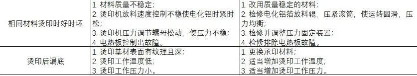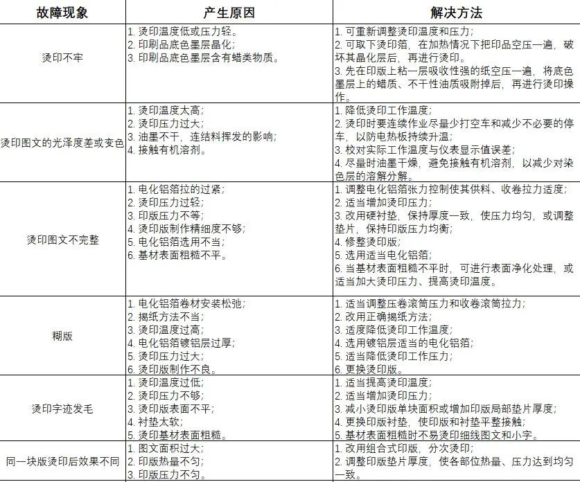在(zai)燙(tang)印(yin)過程(cheng)(cheng)中往往會出現許(xu)多質量問題,實施有效(xiao)的燙(tang)印(yin)質量控(kong)(kong)(kong)制(zhi)(zhi)(zhi)(zhi)必不(bu)可少,主要為印(yin)刷(shua)過程(cheng)(cheng)控(kong)(kong)(kong)制(zhi)(zhi)(zhi)(zhi)(承(cheng)印(yin)物(wu)控(kong)(kong)(kong)制(zhi)(zhi)(zhi)(zhi)、油墨控(kong)(kong)(kong)制(zhi)(zhi)(zhi)(zhi)、印(yin)刷(shua)參數(shu)控(kong)(kong)(kong)制(zhi)(zhi)(zhi)(zhi))和(he)燙(tang)印(yin)過程(cheng)(cheng)控(kong)(kong)(kong)制(zhi)(zhi)(zhi)(zhi)(物(wu)料(liao)控(kong)(kong)(kong)制(zhi)(zhi)(zhi)(zhi)、燙(tang)印(yin)設(she)備控(kong)(kong)(kong)制(zhi)(zhi)(zhi)(zhi)、參數(shu)設(she)置(zhi)控(kong)(kong)(kong)制(zhi)(zhi)(zhi)(zhi))。