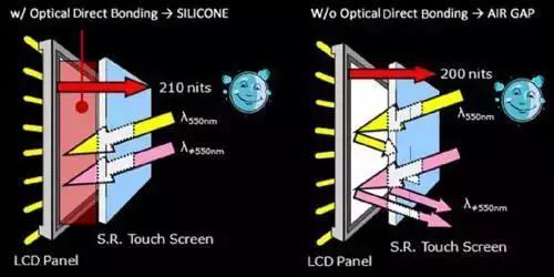 口字貼(右)與全貼合(左)的光線透通(tong)結果比較