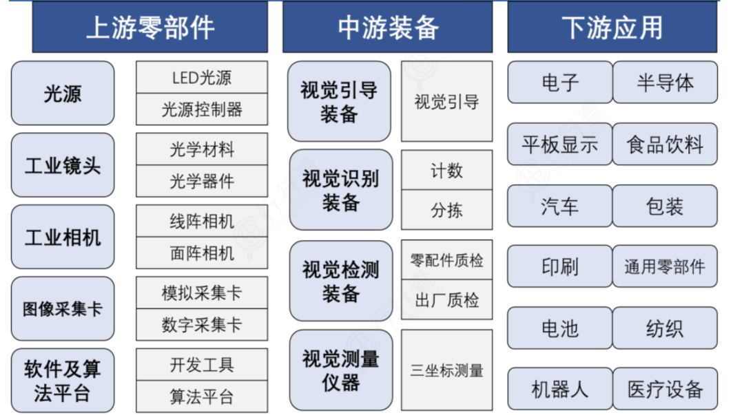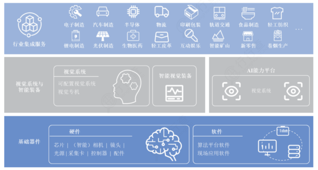 機器視(shi)(shi)覺(jue)可分(fen)為(wei)上游(you)(硬件、算法軟(ruan)件)、中游(you)(視(shi)(shi)覺(jue)系統(tong)、視(shi)(shi)覺(jue)裝備集成)和下游(you)終端(duan)應用。上游(you)涉及的行業(ye)(ye)范圍較為(wei)寬廣,主要包(bao)括光(guang)源、工(gong)業(ye)(ye)鏡頭、工(gong)業(ye)(ye)相機、圖(tu)像(xiang)采(cai)集卡和軟(ruan)件及算法平臺等(deng)(deng)環(huan)節(jie);中游(you)是(shi)機器視(shi)(shi)覺(jue)產業(ye)(ye)鏈最核心(xin)的環(huan)節(jie),由視(shi)(shi)覺(jue)系統(tong)和視(shi)(shi)覺(jue)裝備集成構成;下游(you)為(wei)應用領域,廣泛應用到電子、半導(dao)體(ti)、機器人(ren)、汽車、醫療等(deng)(deng)各行各業(ye)(ye)。