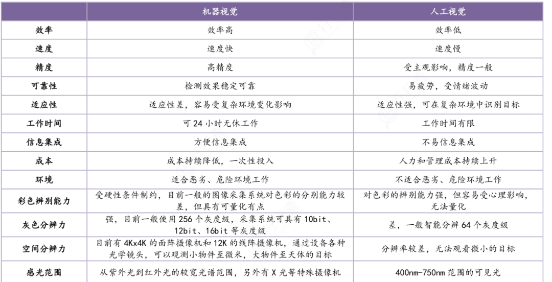 在(zai)(zai)工(gong)(gong)業(ye)領域,機器視(shi)覺相(xiang)對人(ren)眼視(shi)覺存(cun)在(zai)(zai)顯著優(you)勢。機器視(shi)覺擁有精度高(gao)、速度快、適應性強(qiang)、可靠性高(gao)、效率高(gao)等人(ren)工(gong)(gong)視(shi)覺無法比(bi)擬的(de)優(you)勢。在(zai)(zai)我國人(ren)工(gong)(gong)成(cheng)本增加、數字(zi)化轉型、制(zhi)造業(ye)效率和質量要求提(ti)高(gao)的(de)大背景下,正在(zai)(zai)逐步替代人(ren)工(gong)(gong)。