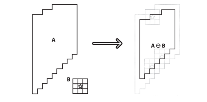 在數學形態學中,設A為(x,y)平面上一目標區域,S為指定大小和形狀的結構元素,定義位于坐標(x,y)上的結構元素S所標識的區域為S(x,y),那么對于A的腐蝕結果可以表示為:腐蝕的原理: