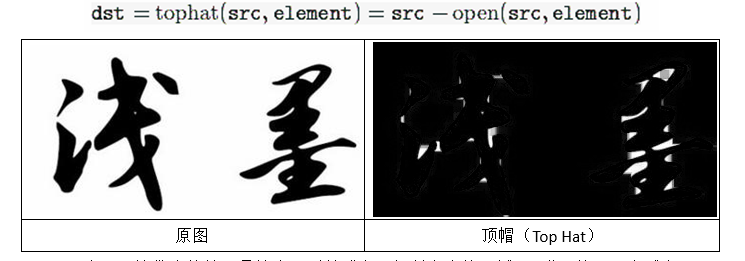 頂(ding)帽運(yun)算(suan)(suan)(Top Hat)又常常被譯為”禮帽“運(yun)算(suan)(suan)。為原圖(tu)像與上文剛(gang)剛(gang)介(jie)紹的(de)“開運(yun)算(suan)(suan)“的(de)結果(guo)圖(tu)之差(cha),數學表達式如下: