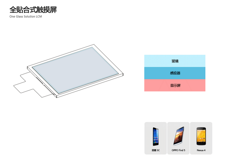 從結構圖可以看出(chu),感(gan)應(ying)器與顯示屏之(zhi)間的(de)(de)玻(bo)璃是(shi)不必要的(de)(de),于是(shi)從2013年開始(shi),主(zhu)流價(jia)位(wei)手機(ji)中(zhong)大量出(chu)現了使用“全(quan)貼合屏幕(mu)”的(de)(de)產(chan)品。