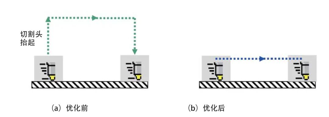 圖(tu)3 切割頭抬起動(dong)作優化前后對比圖(tu)(虛線為切割頭運動(dong)路徑(jing))