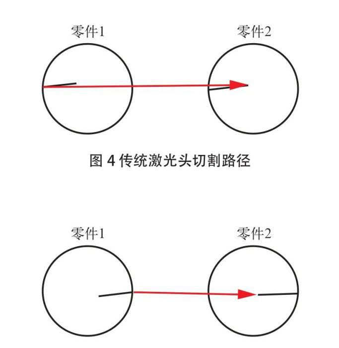 如圖4所示,零件(jian)1割完后,切(qie)(qie)割頭直接沿著(zhu)紅線移到零件(jian)2位(wei)置做切(qie)(qie)割,應該避免下(xia)面(mian)這種情況,如果零件(jian)1未采用(yong)微連接的話(hua),零件(jian)容易翹起來,當切(qie)(qie)割頭從上方走過時,零件(jian)會和切(qie)(qie)割頭發生碰撞。